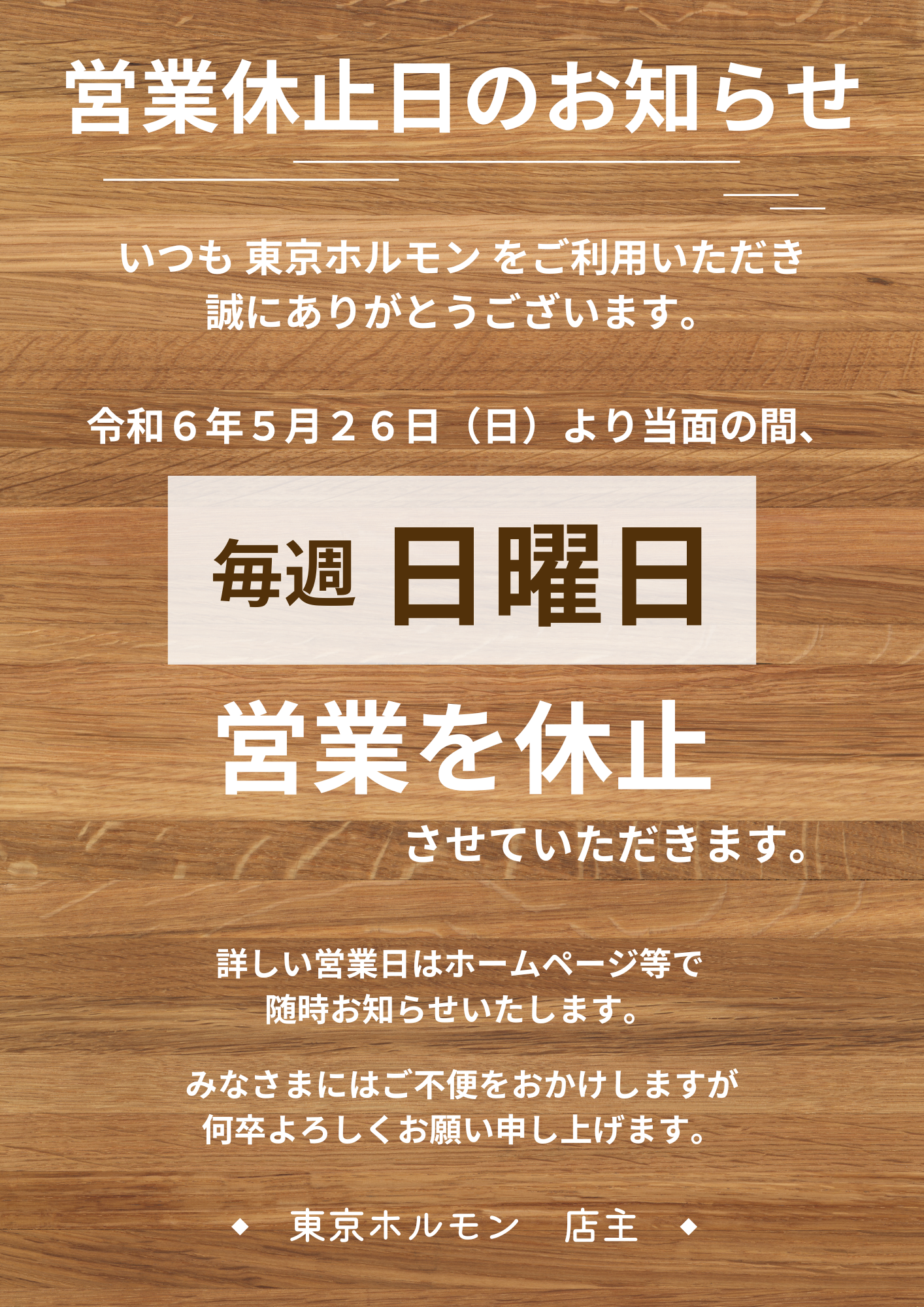 平素よりご愛顧いただき、誠にありがとうございます。このたび当店は体制強化のため、当面の間ではありますが、「日曜日を臨時休業」することになりました。ご不便をおかけしますが、ご理解のほどよろしくお願い申し上げます。